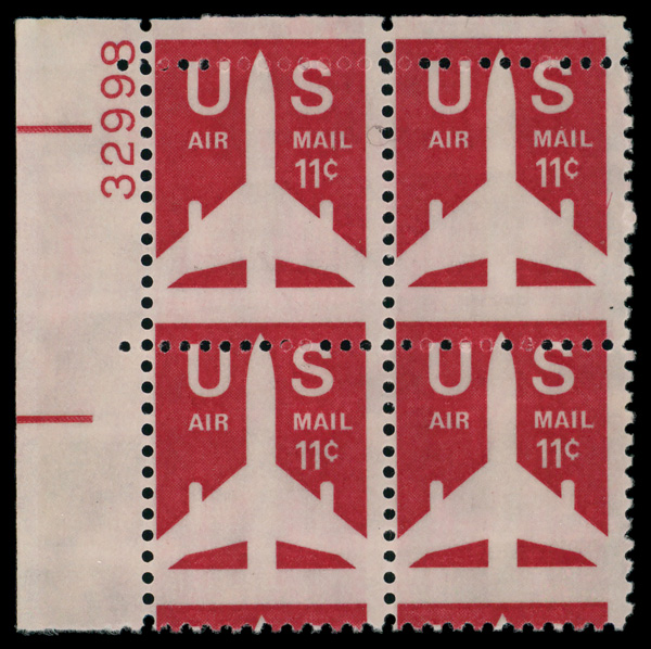 7777 nhbl C78 var. imageAirmail, 1971, 11¢ Jet, misperforation (Scott C78 var.), plate block of 4, this clean example has the perfs shifted downward an plate number 32998, o.g., never hinged (natural gum creases), Very Fine. (Image) Suggested Bid $52