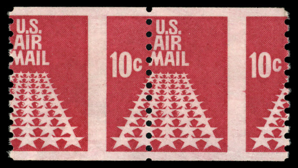 7776 nh C73 var. imageAirmail, 1968, 10¢ Fifty-Star Runway coil, misperforation (Scott C73 var.), pair, bright color on clean paper with the perfs shifted to the right, o.g., never hinged, Very Fine to Extremely Fine. (Image) Suggested Bid $15