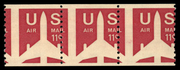 7779 nh C82 var. imageAirmail, 1971, 11¢ Jet coil, misperforation (Scott C82 var.), strip of 3, post office fresh and clean with vertical misperforations, o.g., never hinged (gum wrinkles), Very Fine to Extremely Fine. (Image) Suggested Bid $21