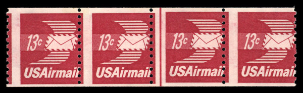 7780 nh C83 var. imageAirmail, 1973, 13¢ Winged Envelope coil, misperforation (Scott C83 var.), line strip of 4, vibrant color and clear crisp design with vertical misperforations throughout, o.g., never hinged, Very Fine to Extremely Fine. (Image) Suggested Bid $30