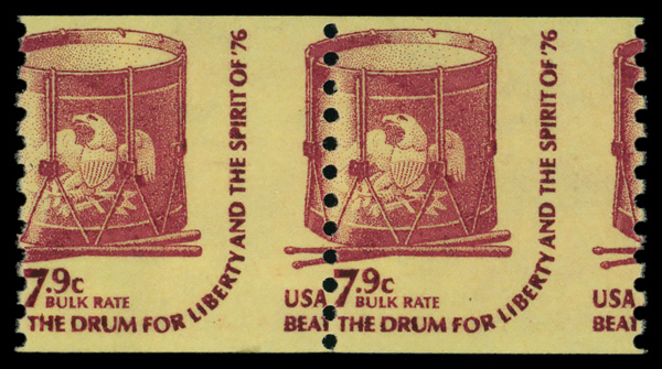 7762 nh 1615 var. image1976, 7.9¢ Drum, horizontal coil, misperforation (Scott 1615 var.), pair, beautiful design on bright yellow paper with a vertical misperforation, o.g., never hinged, Very Fine to Extremely Fine. (Image) Suggested Bid $10