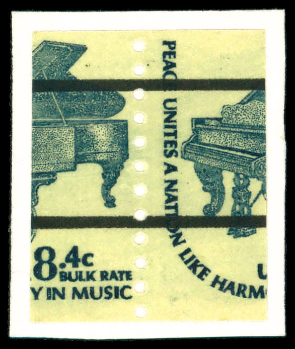 7761 O 1615C var. image1978, 8.4¢ Piano, horizontal coil, misperforation (Scott 1615C var.), single, bright example on paper with a vertical imperforate that splits the piano in half, Very Fine to Extremely Fine. (Image) Suggested Bid $5