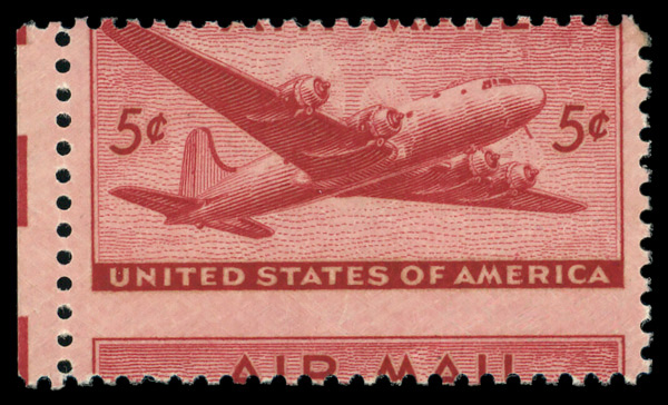 7767 og C32 var. imageAirmail, 1946, 5¢ DC-4 Skymaster, misperforation (Scott C32 var.), single, a horizontal misperforation results in a fascinating example, o.g. (noticeable gum creases) (small spot of gum disturbance), Very Fine to Extremely Fine. (Image) Suggested Bid $26