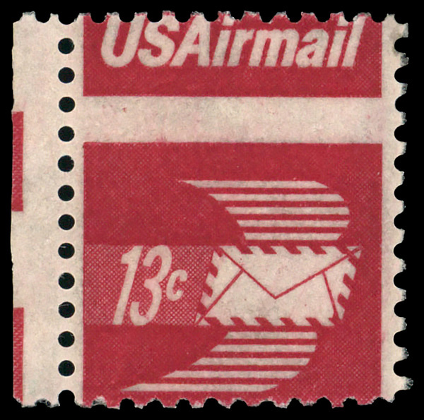 7778 og C79 var. imageAirmail, 1973, 13¢ Winged Envelope, misperforation (Scott C79 var.), single, bright color and sharp lines with a horizontal misperforation, o.g. (small spot of gum disturbance), Very Fine to Extremely Fine. (Image) Suggested Bid $8
