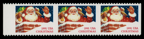 7763 nh 2579a image1991 (29¢) Christmas: Santa in Chimney, horizontal strip, imperf. vertically (Scott 2579a), incredibly centered with vivid color and sharp detail, o.g., never hinged, Extremely Fine to Superb.