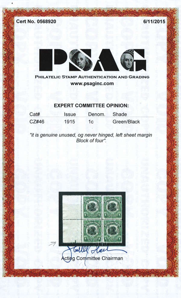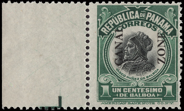 7789 nh 46 image1915, 1c Balboa, green & black, type III overprint (Scott 46), a bright, fresh left sheet margin single, o.g., never hinged, Fine to Very Fine, with a 2015 P.S.E. certificate for the block of 4 from which it was taken.
