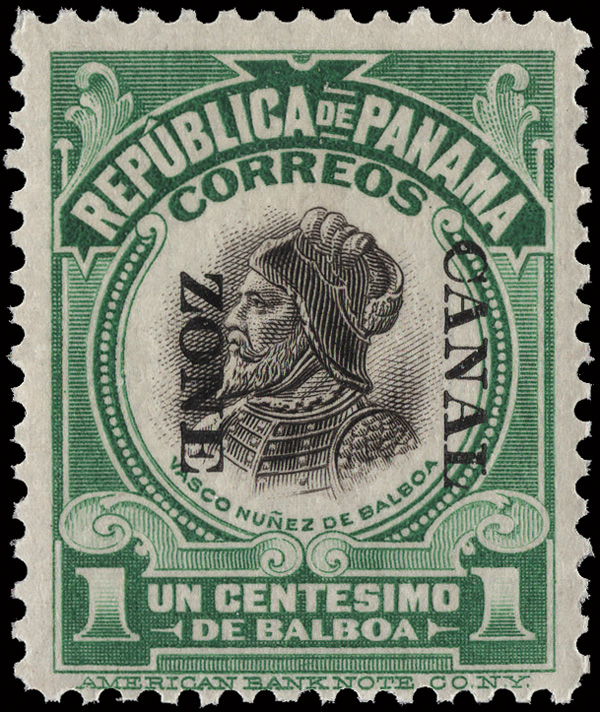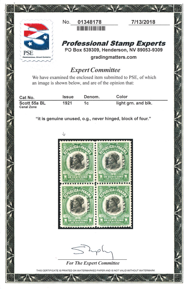 7790 nh 55a image1921, 1c Balboa, light green & black, type V overprint reading down (Scott 55a), o.g., never hinged, bright and fresh, Fine to Very Fine, with a 2018 P.S.E. certificate for the block of 4 from which it was taken.