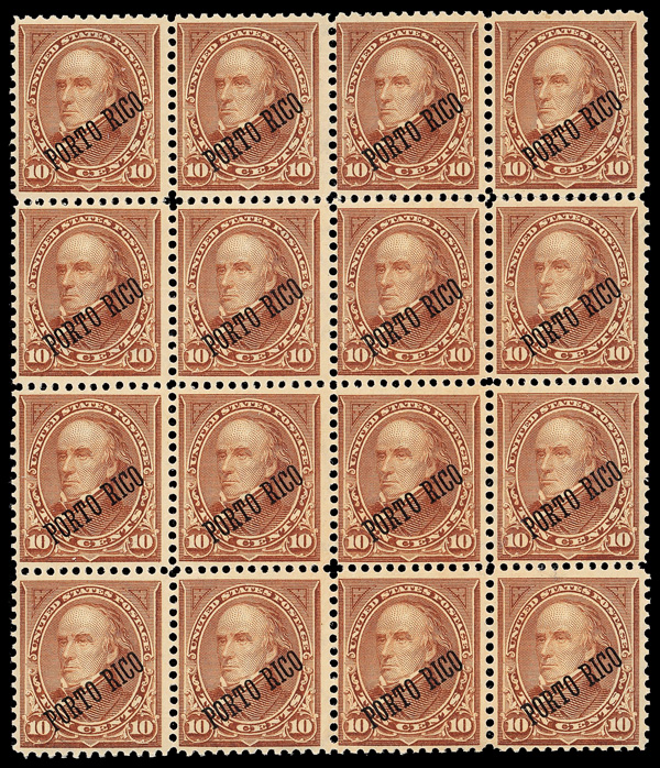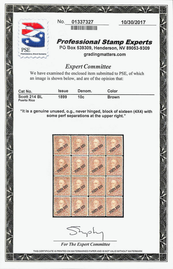 7817 nhbl 214 image1899, 10¢ brown, type I (Scott 214), block of 16, o.g., never hinged, Fine to Very Fine, with 2017 P.S.E. certificate.