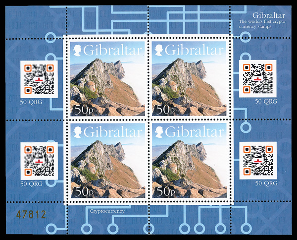 7826 nhbl 1532 footnote image2018, 50p Rock of Gibraltar, crypto-currency miniature sheet of four (Scott 1532 footnote), o.g., never hinged, Post Office fresh and sound, serial number 47812 (of 50,000 issued); unscanned, giving you the chance to earn 200QRG ("Corgi"?) crypto coins, Very Fine, the world's first crypto currency stamps. (Image) Suggested Bid $74