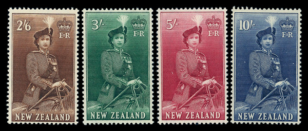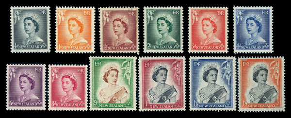 7838 nh/og 288-301 image1953-57, ½d-10sh Queen Elizabeth II definitives, complete (Scott 288-301), set of 16, o.g., some never hinged / some hinged (1½d used), Fine to Very Fine.