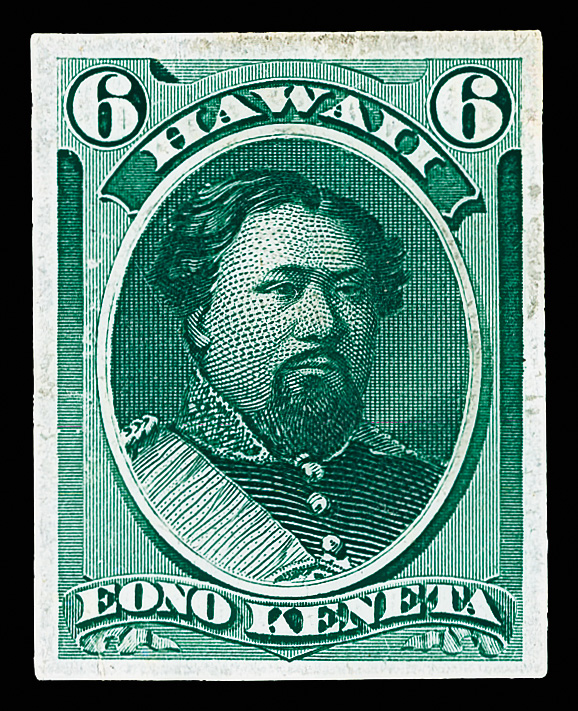 7803 P 33P3 image1871, King Kamehameha V, 6¢ green, plate proof on India paper (Scott 33P3), Post Office fresh with brig color and balanced margins; small thin, otherwise Very Fine.