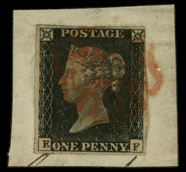 7822 Z 1 image1840, Queen Victoria First Issue, 1d black (Scott 1), single, 4 margin copy with red cancel position "E""F"., Fine to Very Fine.