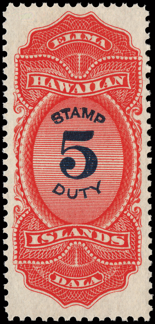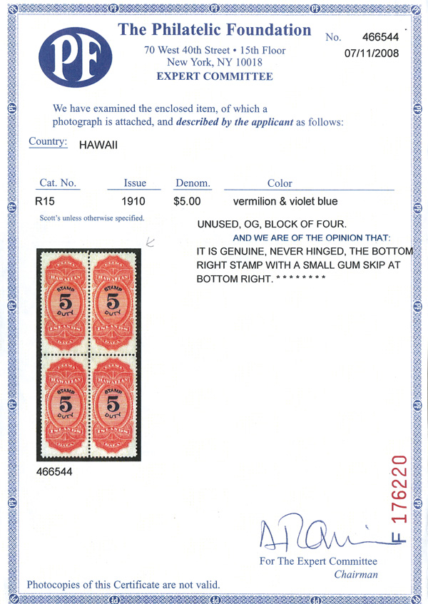 7808 nh R15 imageRevenue, 1910, $5 vermilion & violet blue (Scott R15), o.g., never hinged, fresh and very fine centering, Extremely Fine, with a photocopy of a 2008 P.F. certificate for the block of 4 from which this stamp was taken.
