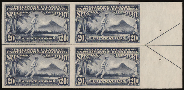 7815 nhbl E6a imageSpecial Delivery, 1925, 20c violet blue (Scott E6a), a choice right arrow block of 4, o.g., never hinged, fresh and clean with large balanced margins, Extremely Fine.