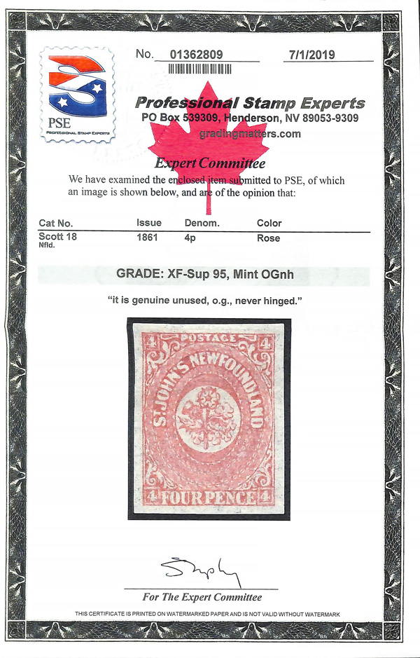 7844 nh 18 image1861, 4d rose (Scott 18), o.g., never hinged, Extremely Fine to Superb, with 2019 P.S.E. certificate graded XF-SUP 95. (Image) (Image2) (All Images)