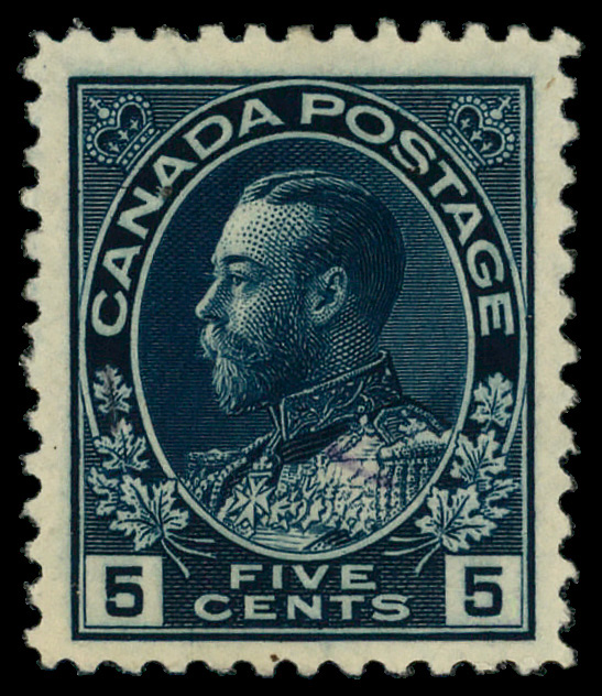 7880 og 111 image1912, King George V "Admiral", 5¢ dark blue (Scott 111), o.g., hinge remnants (pencil mark on gum), Very Fine to Extremely Fine.