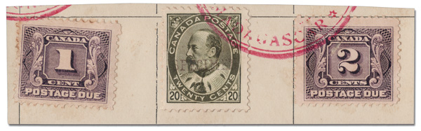 7871 S 94ii image1903, King Edward VII, 20¢ olive green, "SPECIMEN" overprint (Unitrade 94ii), tied on a piece cut from a ledger page, along with unoverprinted 1¢ & 2¢ Postage Dues (J1-J2), the three tied by red Madagascar circular handstamps; the 2¢ was crease before affixing, Very Fine.