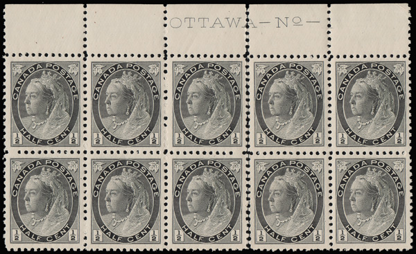7864 nhbl 74 image1898, Queen Victoria "Numeral", ½¢ black (Scott 74), an incredible imprint & plate No. 1 block of 10, o.g., never hinged, fresh and unbelievably well centered across the entire block; unly, it's split into blocks of 6 & 4, destroying the plate block of 6; nonetheless a gorgeous showpiece, Extremely Fine.