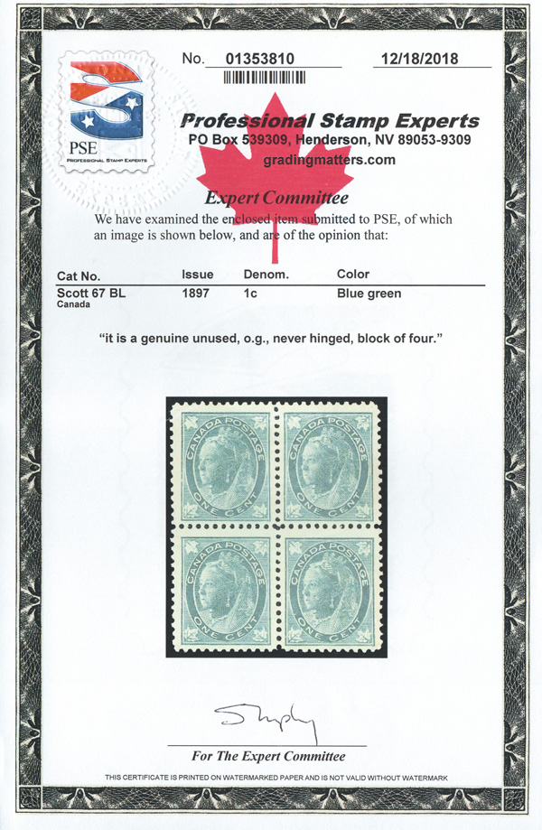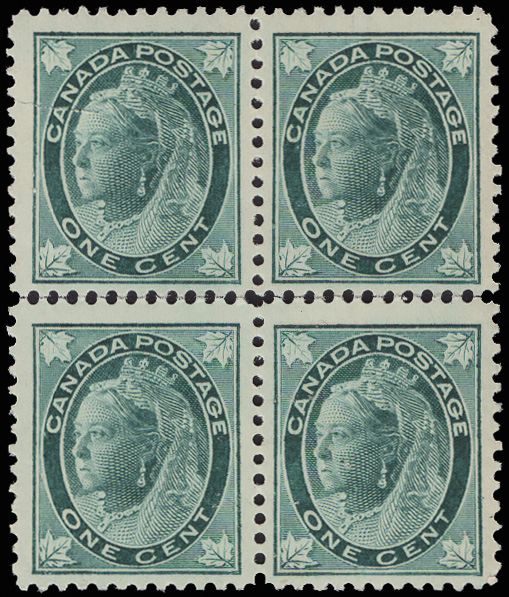 7860 nh 67 image1897, Queen Victoria "Maple Leaf", 1¢ blue green (Scott 67), two bright, fresh horizontal pairs (originally a block), o.g., never hinged, Fine to Very Fine, with a 2018 P.S.E. certificate as a block.