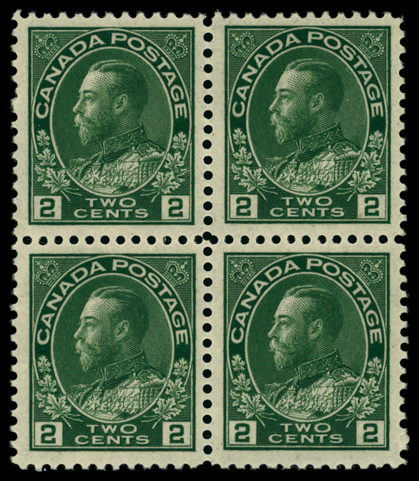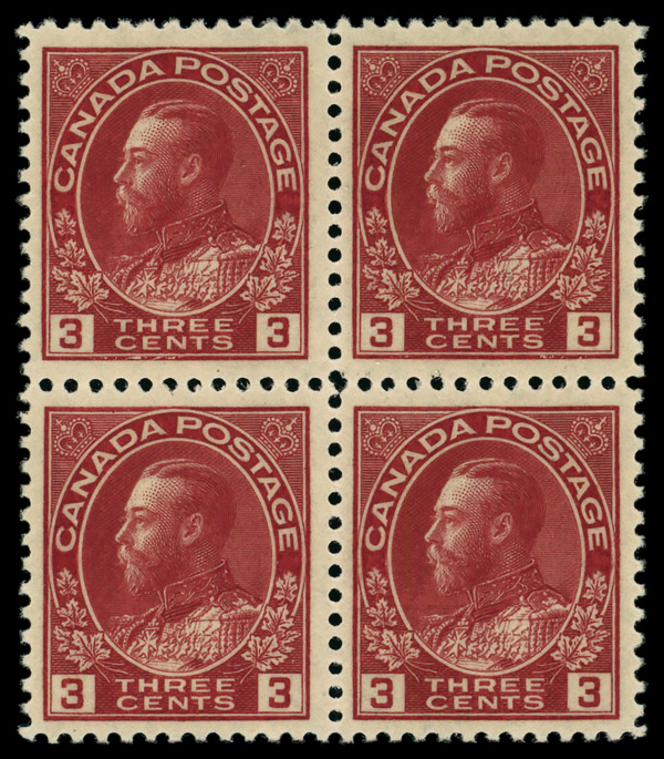 7879 ogbl 109 image1923, King George V "Admiral", 3¢ carmine, type I (Scott 109), block of 4, slightly disturbed o.g., Very Fine to Extremely Fine.