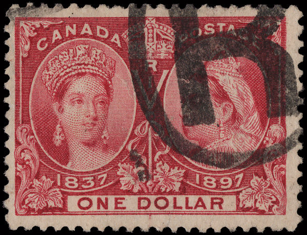 7859 O 61 image1897, Queen Victoria Jubilee, $1 lake (Scott 61), canceled with a bold registry "R" in oval, fresh and Fine to Very Fine.