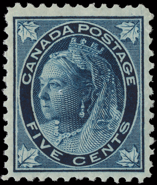 7861 nh 70 image1897, Queen Victoria "Maple Leaf", 5¢ dark blue, on bluish paper (Scott 70), a lovely right sheet margin single, o.g., never hinged, fresh and nicely centered, Very Fine.
