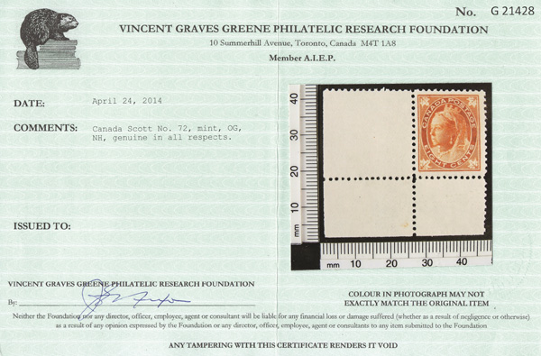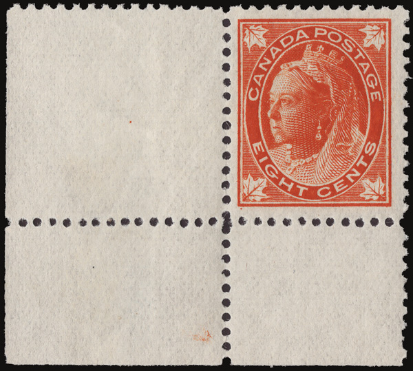 7863 nh 72 image1897, Queen Victoria "Maple Leaf", 8¢ orange (Scott 72), an eye-catching lower left corner sheet margin single, o.g., never hinged, post office fresh and well centered with brilliant color, Very Fine, with a 2014 Greene Foundation certificate.