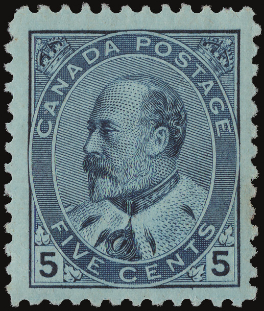 7869 nh 91 image1903, King Edward VII, 5¢ blue, on bluish paper (Scott 91), o.g., never hinged, fresh and nicely centered, Fine to Very Fine.