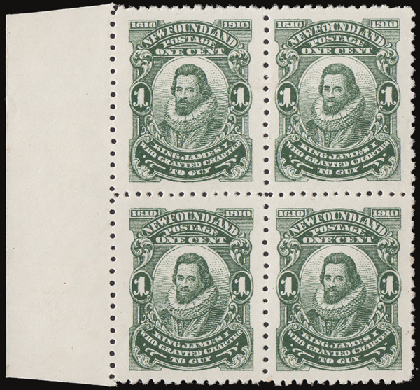 7846 nhbl 87 & vars. image1910, 1¢ Guy Tercentenary, perf 12 x 11, normal & three varieties (Scott 87 & vars.), a choice left sheet margin block of 4, positions 41-42/51-52; the upper left stamp "NFW," upper right "JAMRS," lower left normal, lower right "ONE'CENT", o.g., never hinged, post office fresh and beautifully centered, Extremely Fine.