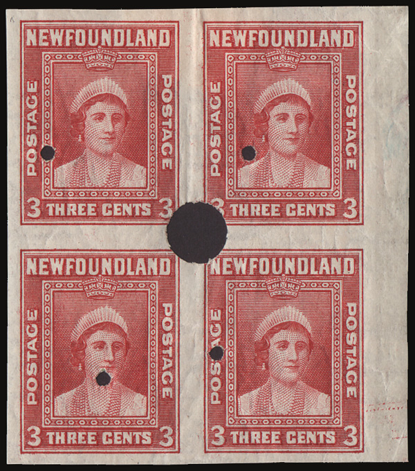 7849 Pbl 255 var. image1941, 3¢ rose carmine, imperf plate proof with security punch (Scott 255 var.), right sheet margin block of 4 punched with a large central hole and each stamp with a tiny hole, o.g., never hinged; usual natural paper wrinkles, Extremely Fine.