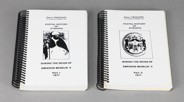 8113 L tristant postal history of ethiopia imageTristant, Henri, Postal History of Ethiopia During the Reign of Emperor Menelik II, two-volume spiral-bound set, 512 pp. in total; clean and sound. Shipping charges apply - weight 2.1 lbs. (Image) Suggested Bid $6