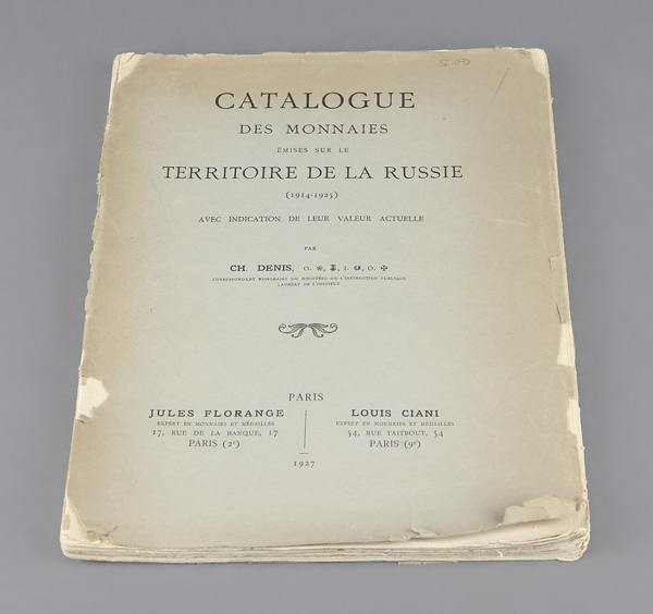 8101 L Denis Catalogue des monnaies émises imageDenis, Ch., Catalogue des monnaies émises sur le territoire de la russie (1914-1925), paperback, 121 pp.; cover damaged with signatures separated, but all present and accounted for. Shipping charges apply - weight 0.8 lbs. (Image) Suggested Bid $6