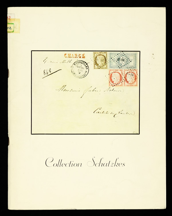 8082 L robineau collection schatzkes imageRobineau Auctions, Collection Schatzkes, paperback, 103pp.; auction of France 1862-71 Issues held in Paris, April 13-14, 1976; replete with great rarities, strong in mint multiples, errors and varieties, Franco-Prussian War uses, foreign destinations, etc., etc., photocopy of prices realized; catalog with few manuscript notations; rare catalog of a great collection, F-VF. Shipping charges apply - weight 0.8 lbs. (Image) Suggested Bid $6