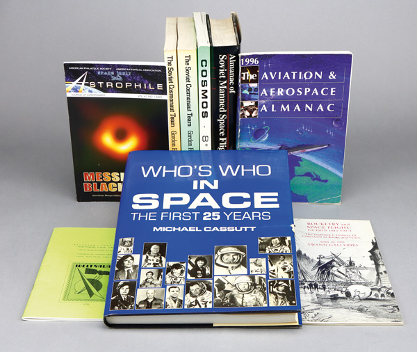 8100   imageMini Space Library Collection, 5 volumes plus a few booklets for space enthusiasts; Almanac of Soviet Manned Space Flight (Newkirk), Who's Who in Space (Cassutt), Espace Lollini COSMOS (8th Ed), 2 Vol The Soviet Cosmonaut Team (Hooper); plus some useful booklets. Shipping charges apply - weight 11 lbs. (Image) Suggested Bid $26