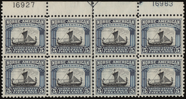 7165 ogbl 621 image1925, 5¢ Norse-American (Scott 621), a lovely Plate #F16927/F16963 block of 8, o.g., lightly hinged, fresh and exceptionally well centered, Very Fine.