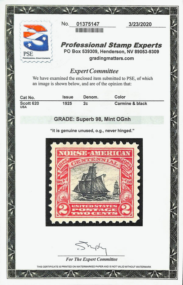 7162 nh 620 image1925, 2¢ Norse-American (Scott 620), Bright, clear color, o.g., never hinged, Superb, with 2020 P.S.E. certificate graded SUP 98.