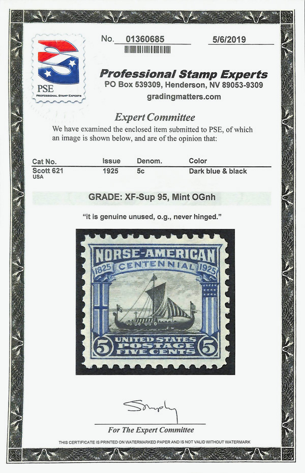 7164 nh 621 image1925, 5¢ Norse-American (Scott 621), Bright, lively colors, o.g., never hinged, Extremely Fine to Superb, with 2019 P.S.E. certificate graded XF-SUP 95.