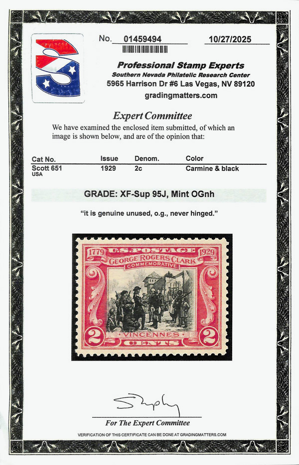 7175 nh 651 image1929, 2¢ George Rogers Clark (Scott 651), Centered with balance, o.g., never hinged, Extremely Fine to Superb, with 2025 P.S.E. certificate graded XF-SUP 95J.