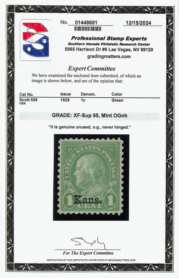 7176 nh 658 image1929, 1¢ Kans. (Scott 658), Clean paper brightness, o.g., never hinged, Extremely Fine to Superb, with 2024 P.S.E. certificate graded XF-SUP 95.