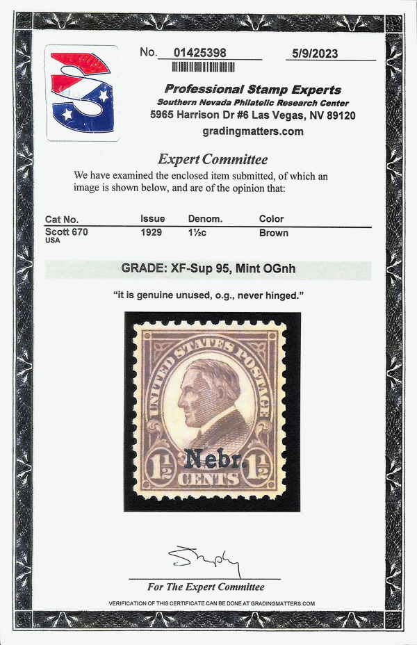 7187 nh 670 image1929, 1½¢ Nebr. (Scott 670), Fresh color strength, o.g., never hinged, Extremely Fine to Superb, with 2023 P.S.E. certificate graded XF-SUP 95.