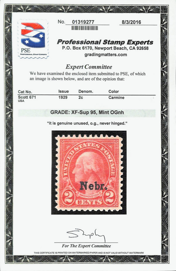7188 nh 671 image1929, 2¢ Nebr. (Scott 671), Fresh color balance, o.g., never hinged, Extremely Fine to Superb, with 2016 P.S.E. certificate graded XF-SUP 95.