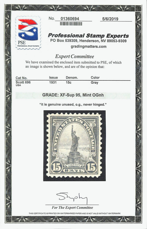 7198 nh 696 image1931, 15¢ Statue of Liberty, rotary press printing (Scott 696), Fresh impression quality, o.g., never hinged, Extremely Fine to Superb, with 2019 P.S.E. certificate graded XF-SUP 95.