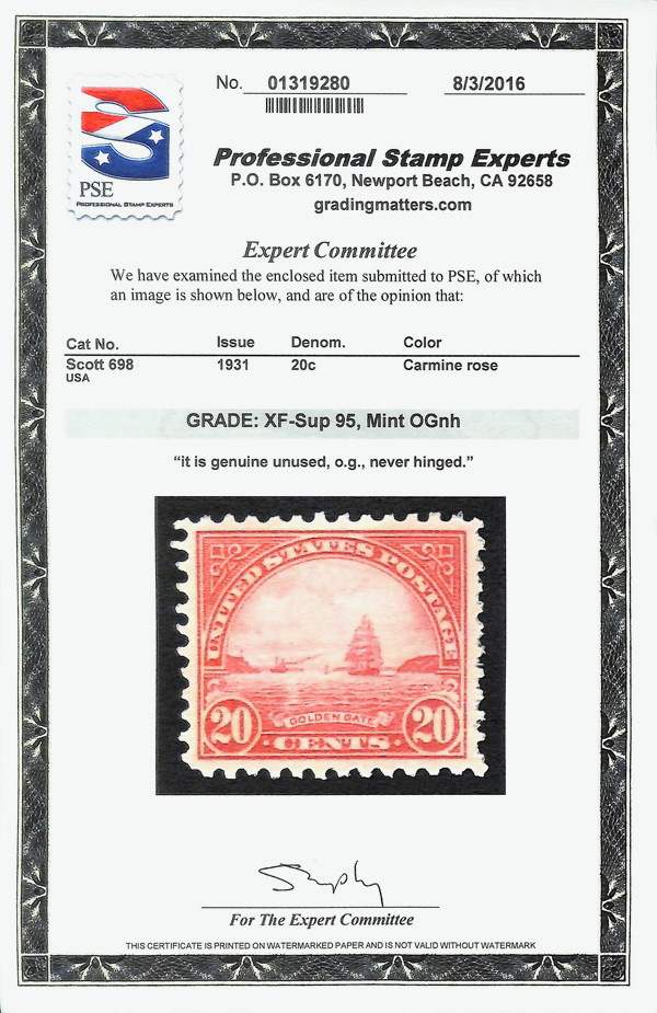 7199 nh 698 image1931, 20¢ Golden Gate, rotary press printing (Scott 698), Balanced centering throughout, o.g., never hinged, Extremely Fine to Superb, with 2016 P.S.E. certificate graded XF-SUP 95.