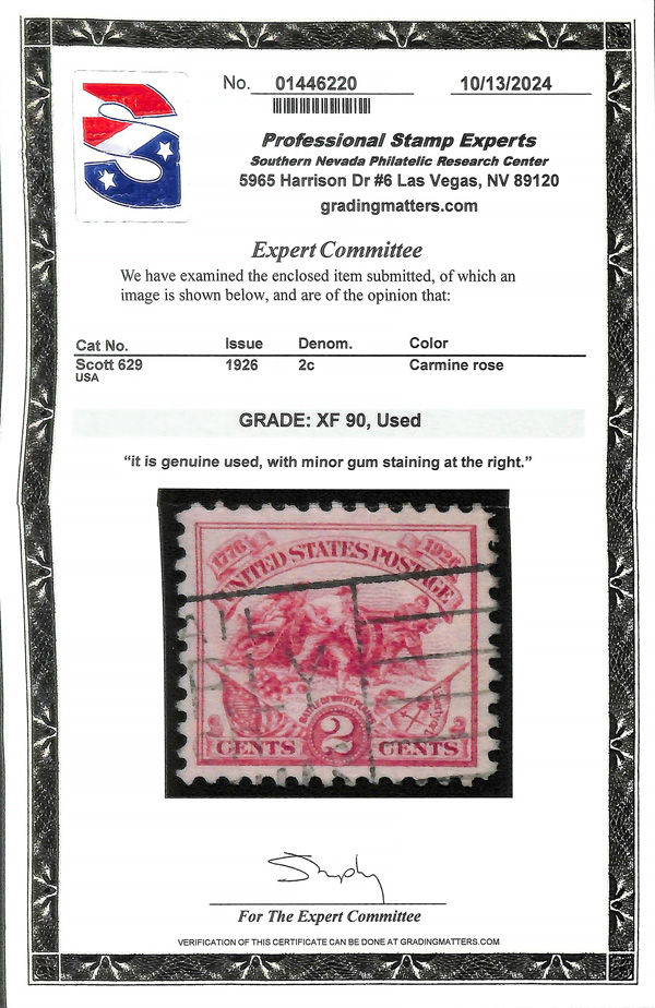 7170 O 629 image1926, 2¢ White Plains (Scott 629); minor gum staining at right, Extremely Fine, with 2024 P.S.E. certificate graded XF 90.
