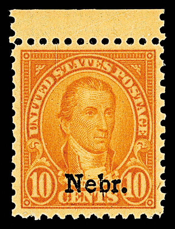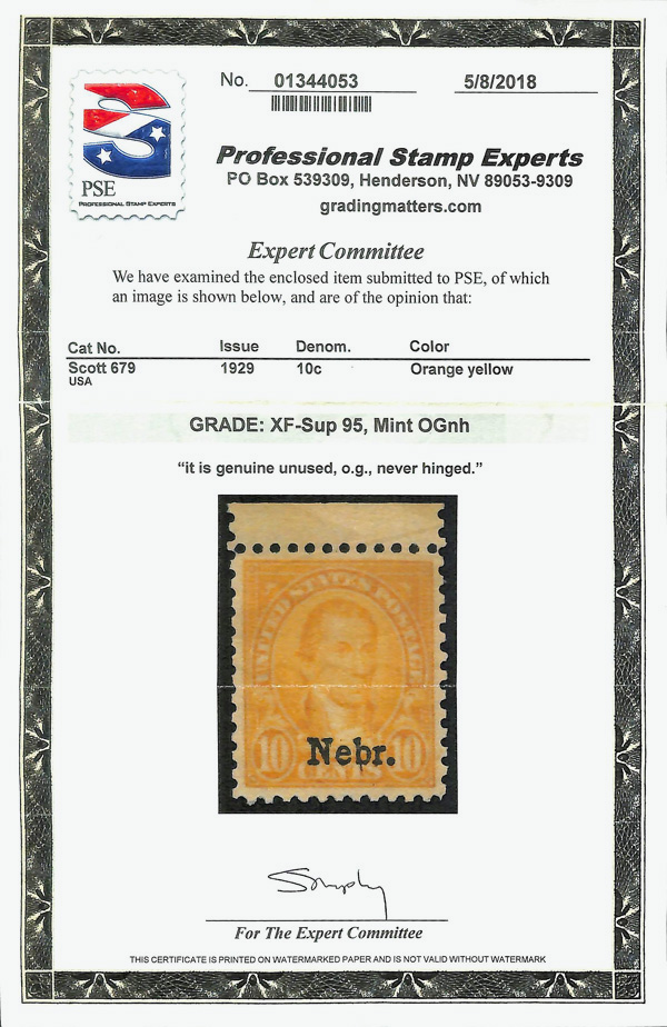 7196 nh 679 image1929, 10¢ Nebr. (Scott 679), fresh and radiant, o.g., never hinged, Extremely Fine to Superb, with 2018 P.S.E. certificate graded XF-SUP 95.