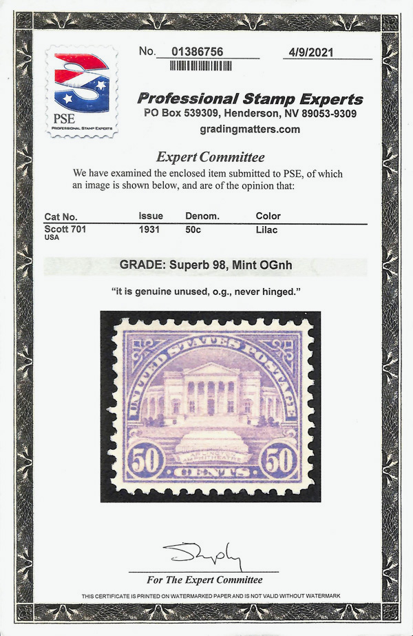 7200 nh 701 image1931, 50¢ Arlington Amphitheater, rotary press printing (Scott 701), strong impression, bold hue, o.g., never hinged, Superb, with 2021 P.S.E. certificate graded SUP 98.