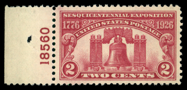 7169 nh 627 image1926, 2¢ Sesquicentennial Exposition (Scott 627), plate number single, o.g., never hinged, Extremely Fine. (Image) Suggested Bid $13