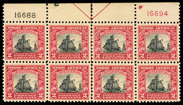 7163 nh/ogbl 620 image1925, 2¢ Norse-American (Scott 620), top margin plate block of 8 with plate numbers 16688 and F 16694, Clear rich tone preserved, o.g., top center stamps with small hinge remnant (6 stamps never hinged), Very Fine.