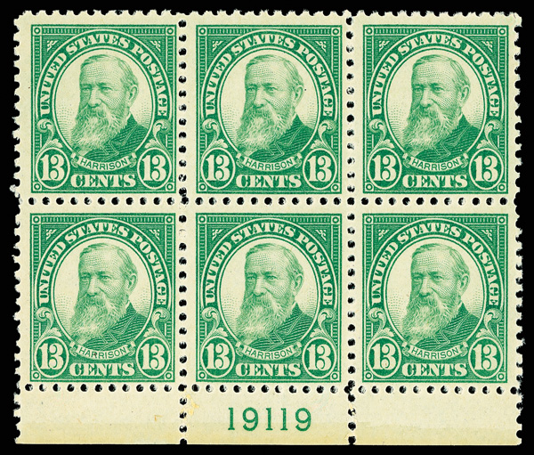 7166 nhbl 622 image1926, 13¢ Harrison (Scott 622), bottom margin plate block of 6 with plate number 19119, Inviting color with crisp strength, o.g., never hinged, Fine to Very Fine.