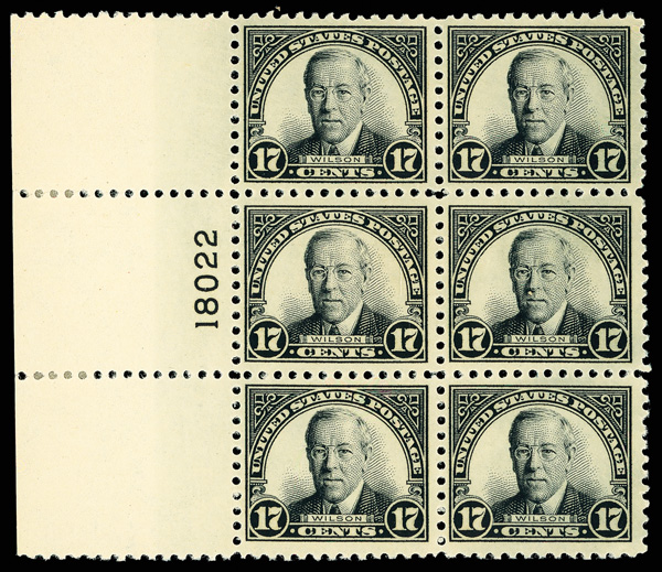 7168 nh/ogbl 623 image1925, 17¢ Wilson (Scott 623), wide left margin plate block of 6 with plate number 18022, Crisp fresh surface tone, o.g., hinge remnant (4 top and bottom stamps never hinged), Fine to Very Fine.